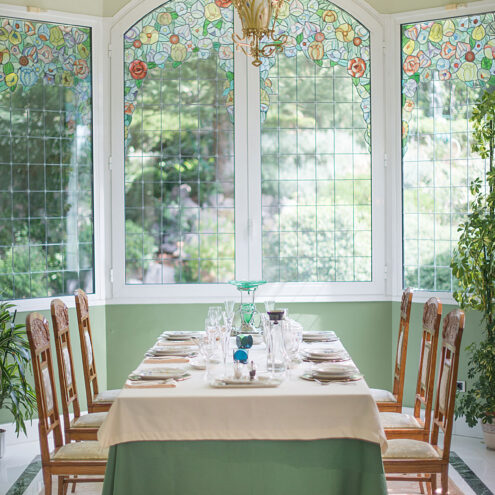 El saló principal està decorat seguint l’estil modernista i es caracteritza per una impressionant vidriera feta a ma. És un espai amb molta llu natural, acollidor i amb unes vistes privilegiades al jardí, a l’estanc i al jardí botànic.